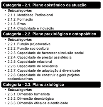 Na figura nº 2 percebemos que quer no plano visível, quer no plano invisível as leituras dos estudantes decorrem de um olhar triádico do Educador Social, que categorizamos da seguinte forma: plano epistémico da atuação; plano praxiológico e ontopoiético e plano axiológico. Tentaremos a seguir, através da identificação de subcategorias e da sua análise perceber a hierarquização desses planos e dos níveis visível e invisível da profissão de Educador Social segundo os estudantes.