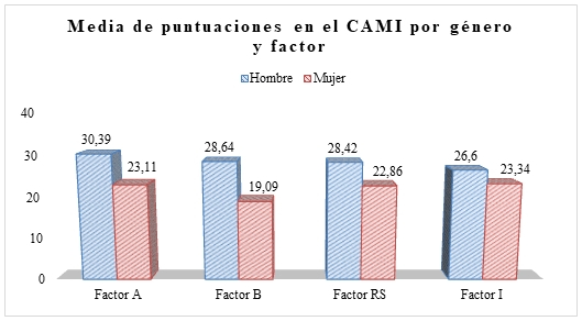 Gráfico 4. Medias de puntuaciones en el CAMI por género y factor.