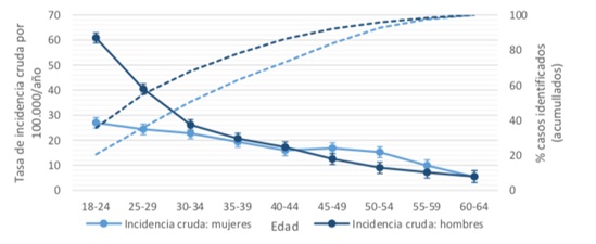 Figura 1. Tasa de incidencia cruda y porcentaje de casos acumulados de trastornos psicóticos