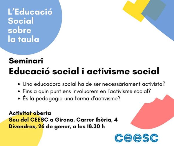 El Col·legi d’Educadores i Educadors Socials de Catalunya (CEESC) informa en su Web de la siguiente actividad formativa: Seminario: Educación Social sobre la mesa. Educación social y activismo social