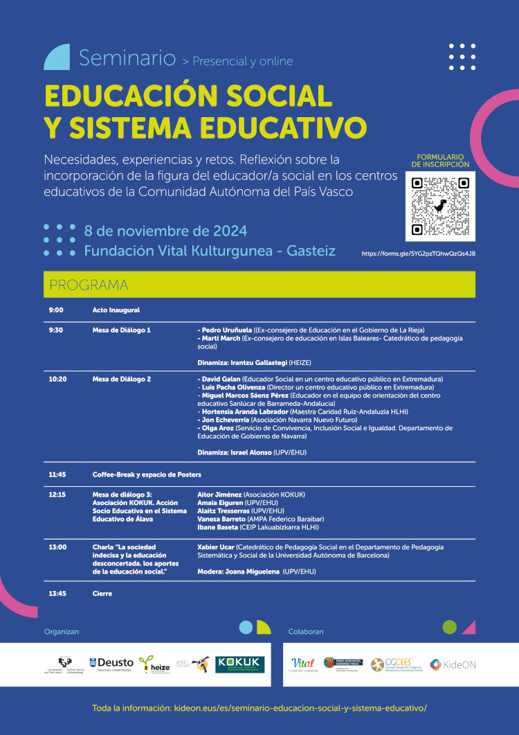 Seminario: “Educación social y sistema educativo. Necesidades, experiencias y retos. Reflexión sobre la incorporación de la figura de la Educación Social en los centros educativos del País Vasco” Con el objetivo de debatir las investigaciones y experiencias en este ámbito el 8 de noviembre de 2024 en la sala A de la Fundación Vital (UPV/EHU) formato bimodal organizamos este seminario abierto a toda la comunidad política, académica, profesional y social relacionada con la temática.