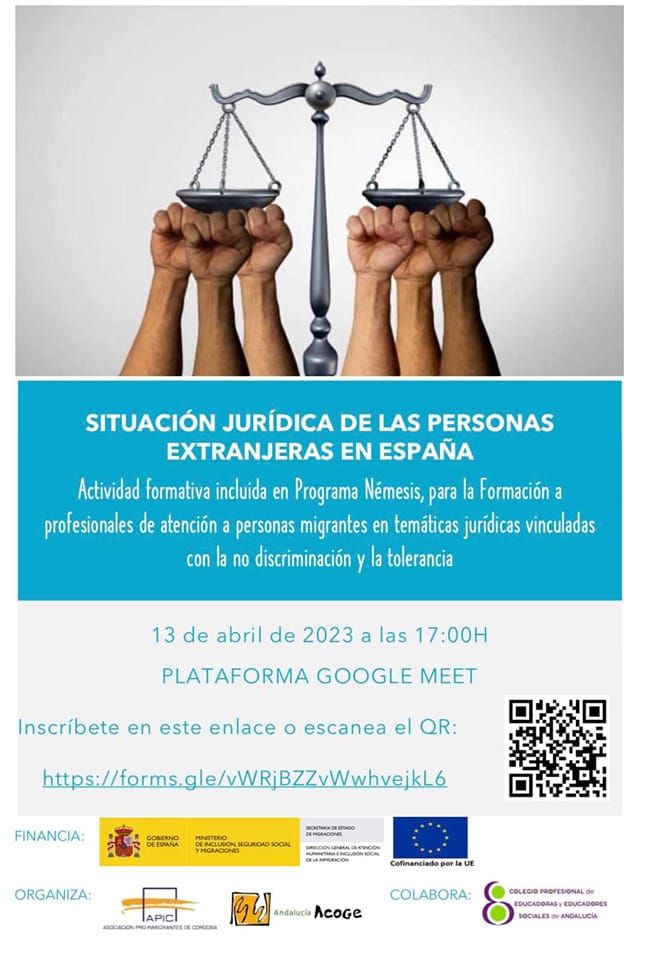El Colegio Profesional de Educadoras y Educadores Sociales de Andalucía (CoPESA) colabora en la actividad formativa «Situación jurídica de las personas extranjeras en España«, que APIC Andalucía Acoge pone en marcha dirigida a profesionales, dentro del Proyecto Némesis, que se realizará el 13 de abril a las 17:00h en la plataforma Google Meet.