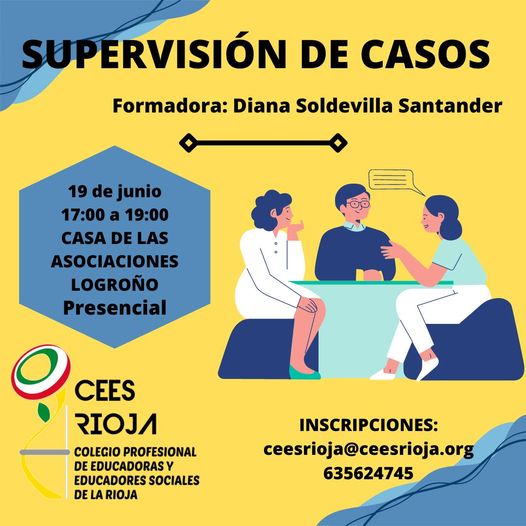 El Colegio Profesional de Educadoras y Educadores Sociales de La Rioja (CEESRIOJA) organiza el lunes 19 de junio una nueva sesión de «Supervisión de casos«, será presencial. Dirigido por Diana Soldevilla @ojosabiertos.terapiafamiliar. Si estás interesada/o ponte en contacto (Email ceesrioja@ceesrioja.org Teléfono 635 624 745). En esta ocasión el horario será de 17:00 a 19:00 en la Casa de las Asociaciones de Logroño.