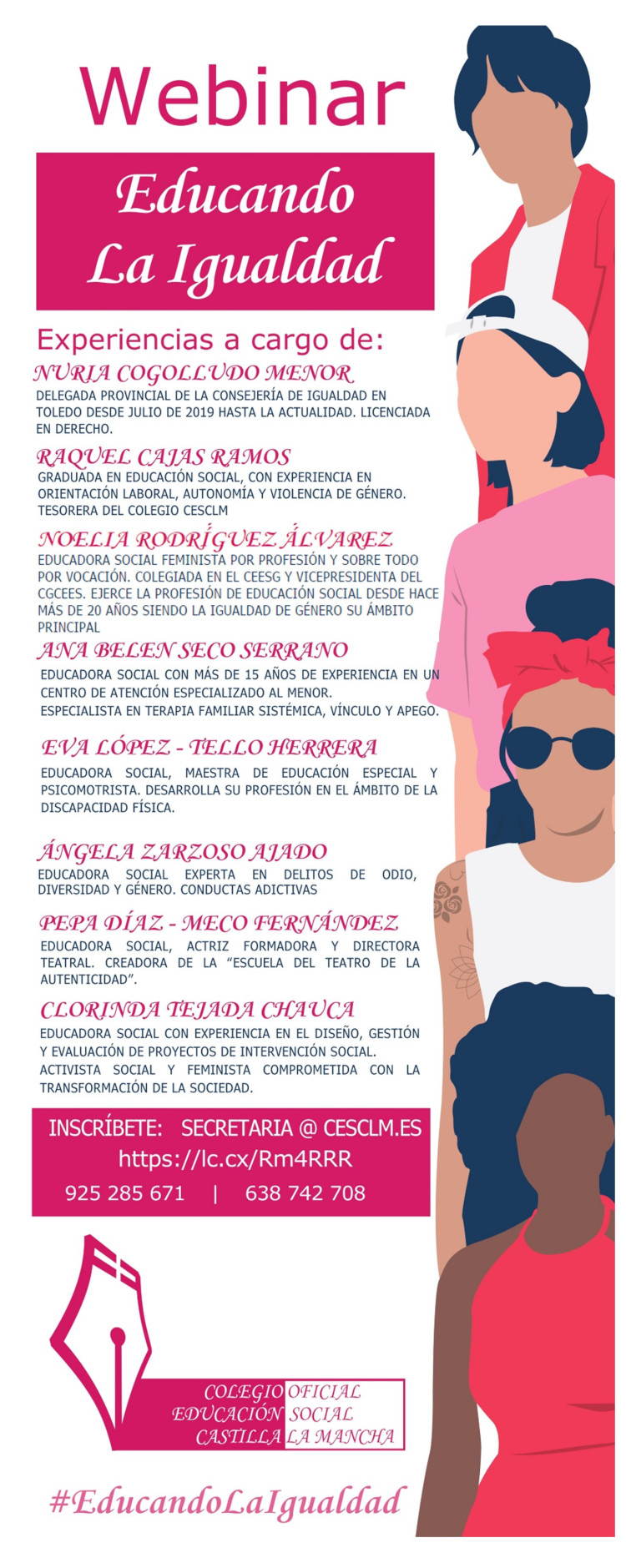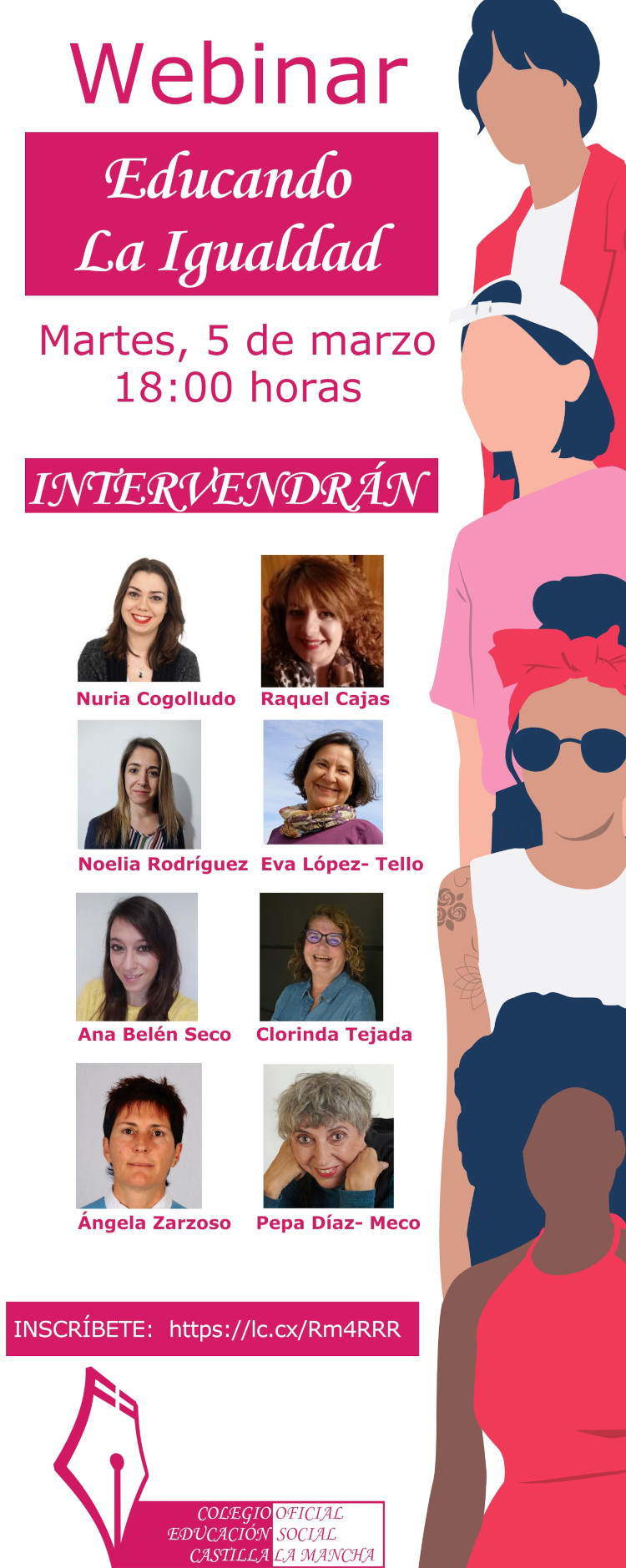 Descripción: El Colegio Oficial de la Educación Social (CESCLM), con motivo del Día Internacional de la Mujer, organiza el Webinar: “Educando la igualdad” el martes 5 de marzo de 2024 a las 18:00 horas