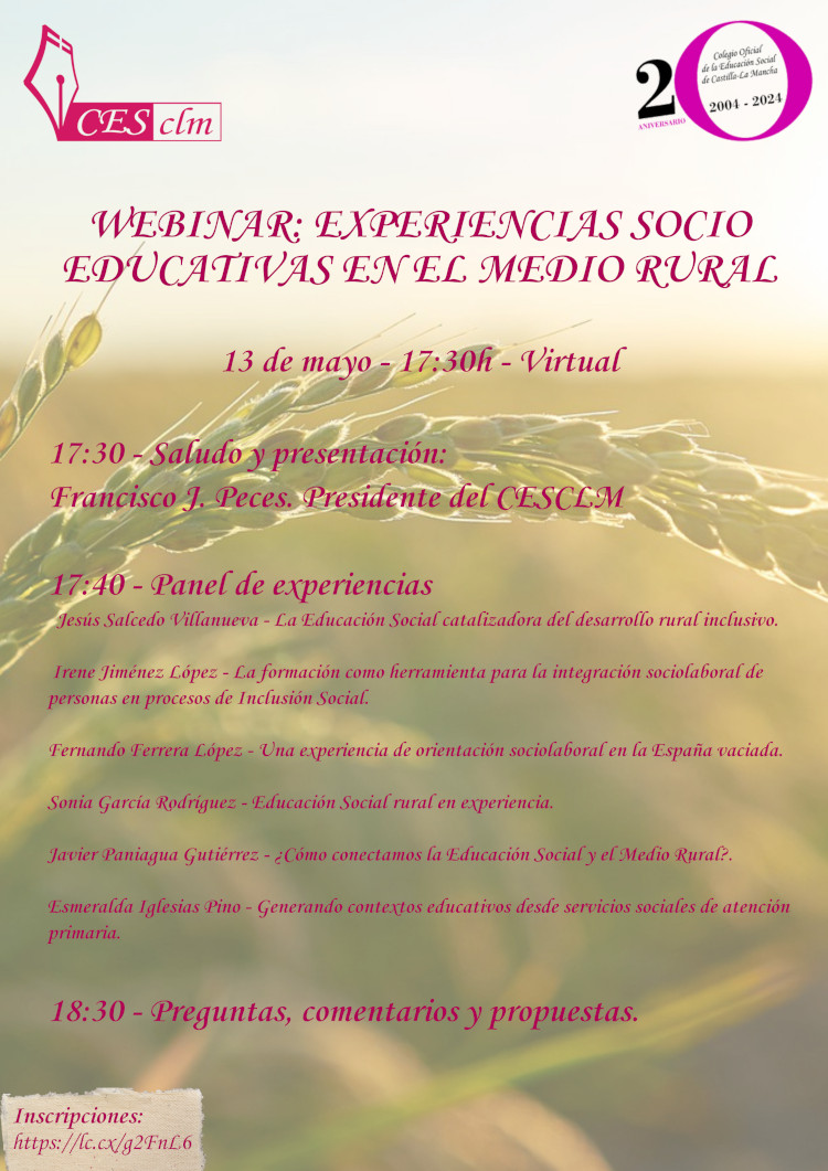 Descripción: El Colegio Oficial de la Educación Social de Castilla-La Mancha (CESCLM), organiza el Webinar “Experiencias Socioeducativas en el Medio Rural”, que tendrá lugar el próximo lunes 13 de mayo a las 17:30 horas