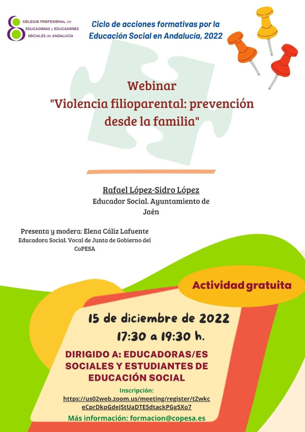 El Colegio Profesional de Educadoras y Educadores Sociales de Andalucía (CoPESA), organiza el 15 de diciembre de 2022, desde las  17:30h. el Webinar ” Violencia filioparental: prevención desde la familia”, cuya información adjuntamos en imagen.