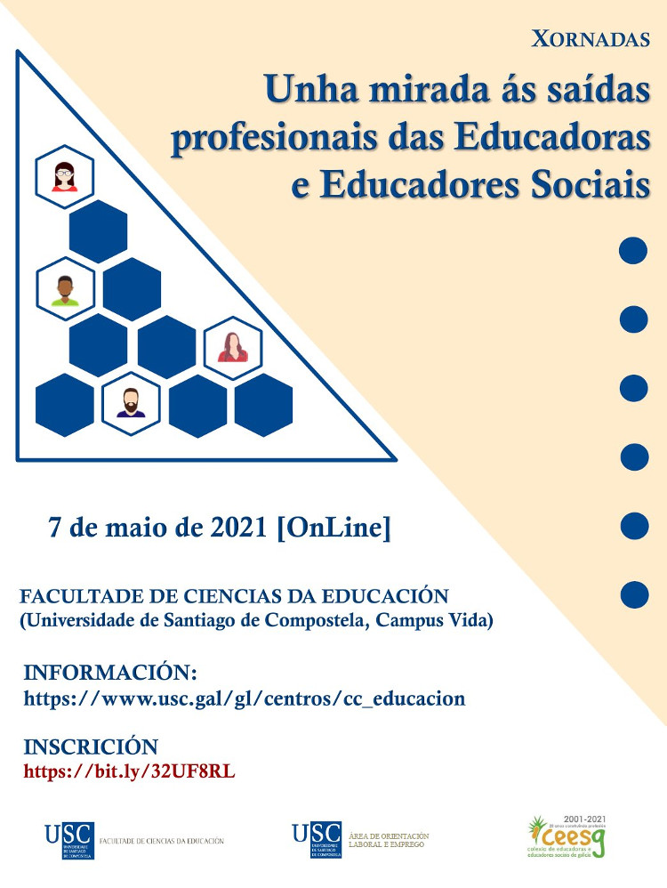 La Facultad de Ciencias de la Educación de la Universidad de Santiago de Compostela organiza una Xornada «Unha mirada ás saídas profesionais das Educadoras e Educadores Sociais«, que se celebrarán el 7 de mayo de 2021.